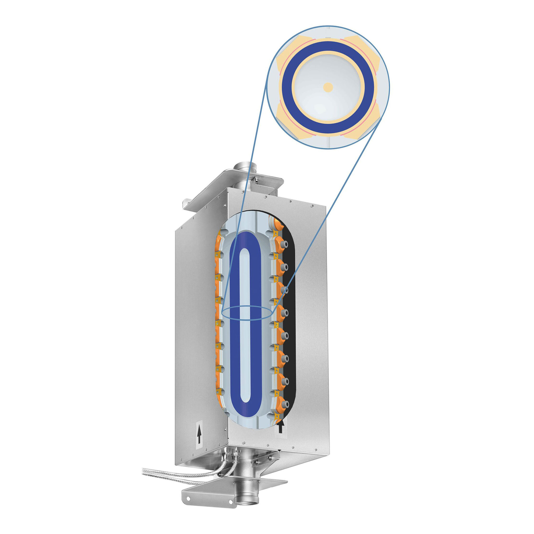 Den definerede strømning af det flydende medium, der skal sonikeres, gennem en dobbelt spalte i BANDELIN vortex-reaktoren garanterer homogen sonikering på den særligt kavitationsintensive indre overflade af reaktorrøret og i det intensive lydfelt i området omkring den dobbelte spalte. Ekstra turbulens i det medie, der skal sonikeres, når det kommer ind i reaktorrøret, forbedrer homogeniseringen yderligere.