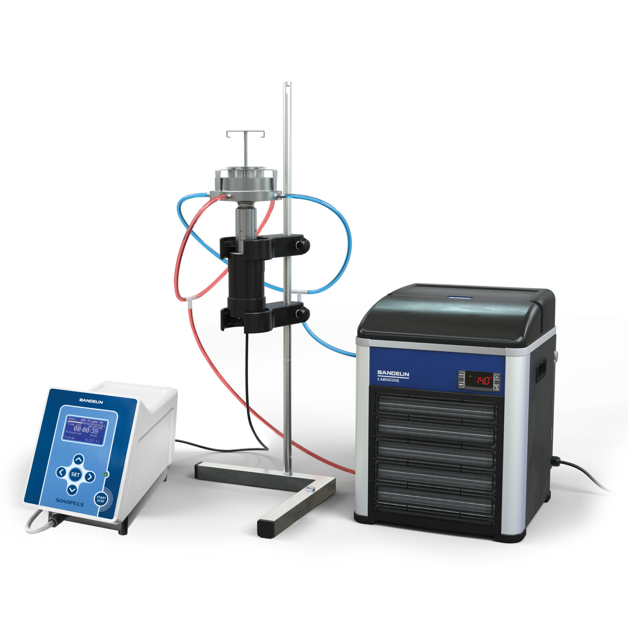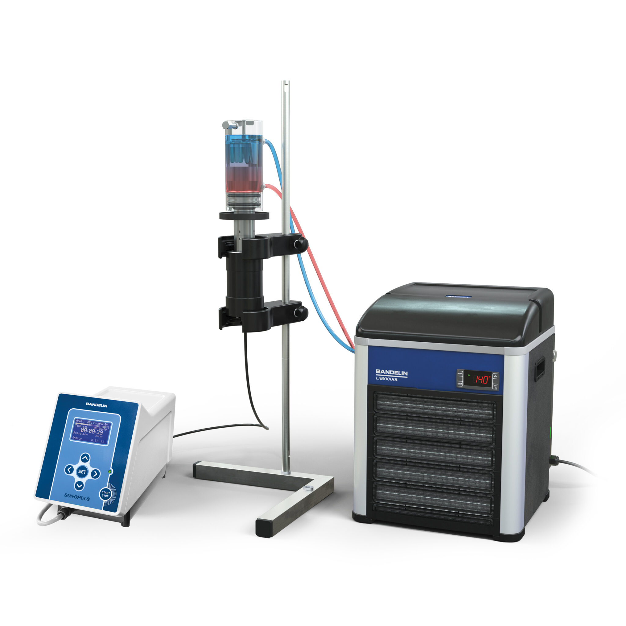 The laboratory cooler LABOCOOL LC 200 is used to dissipate process heat or to cool samples in open vessels during sonication with the SONOPULS ultrasonic homogeniser. Compared to conventional laboratory coolers, the LC 200 is characterised by a closed water circuit without an equalisation tank. This ensures a constant water level in the sonication vessel and prevents overflowing. Due to the natural refrigerant R-290, the laboratory cooler is particularly efficient and climate-friendly.