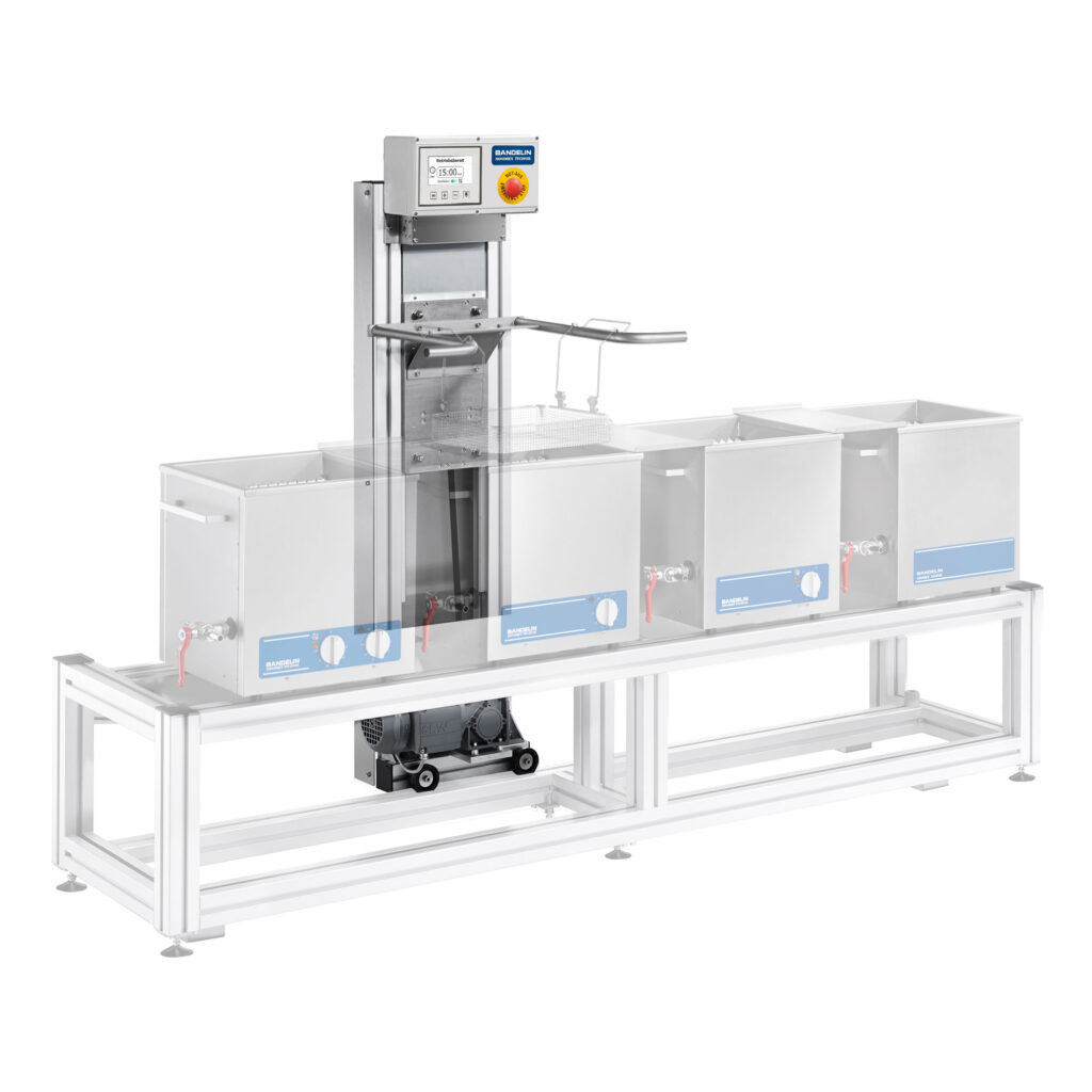 El dispositivo de elevación de accionamiento eléctrico con oscilación facilita el descenso y la elevación de la cesta. El movimiento de oscilación lenta hacia arriba y hacia abajo aumenta el efecto de limpieza de los ultrasonidos y la suciedad disuelta se aclara con mayor eficacia. Una vez transcurrido el tiempo establecido, el dispositivo de elevación vuelve a su posición inicial para que los artículos que se van a limpiar se escurran. Junto con un soporte para bandejas, la cesta puede desplazarse entre los distintos aparatos.