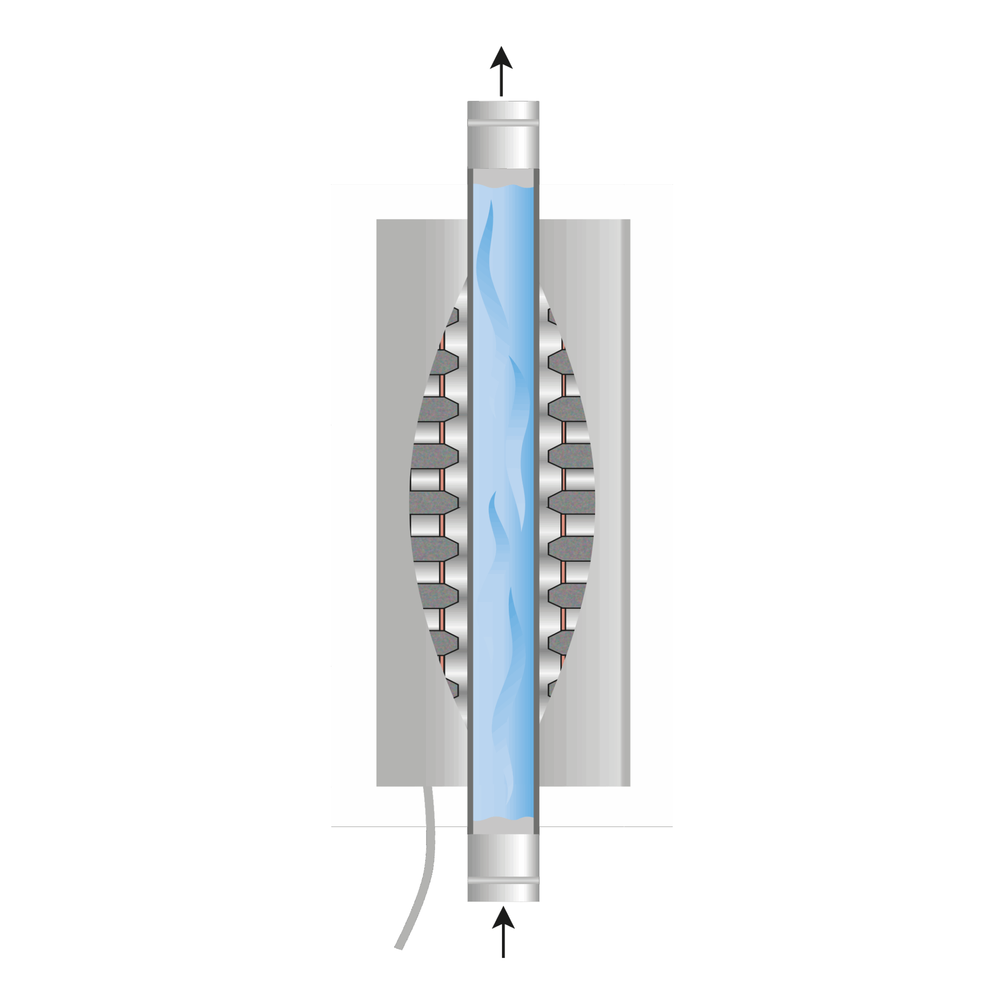 Il reattore tubolare consente il trattamento di flussi ad alto volume nell'ingegneria di processo e viene utilizzato anche nella pulizia dei fili. I sistemi di vibrazione sono montati all'esterno del tubo del reattore, il che significa che non sono necessari elementi interni al tubo del reattore. Il reattore tubolare è quindi particolarmente insensibile ai blocchi durante la sonicazione di substrati contenenti solidi.