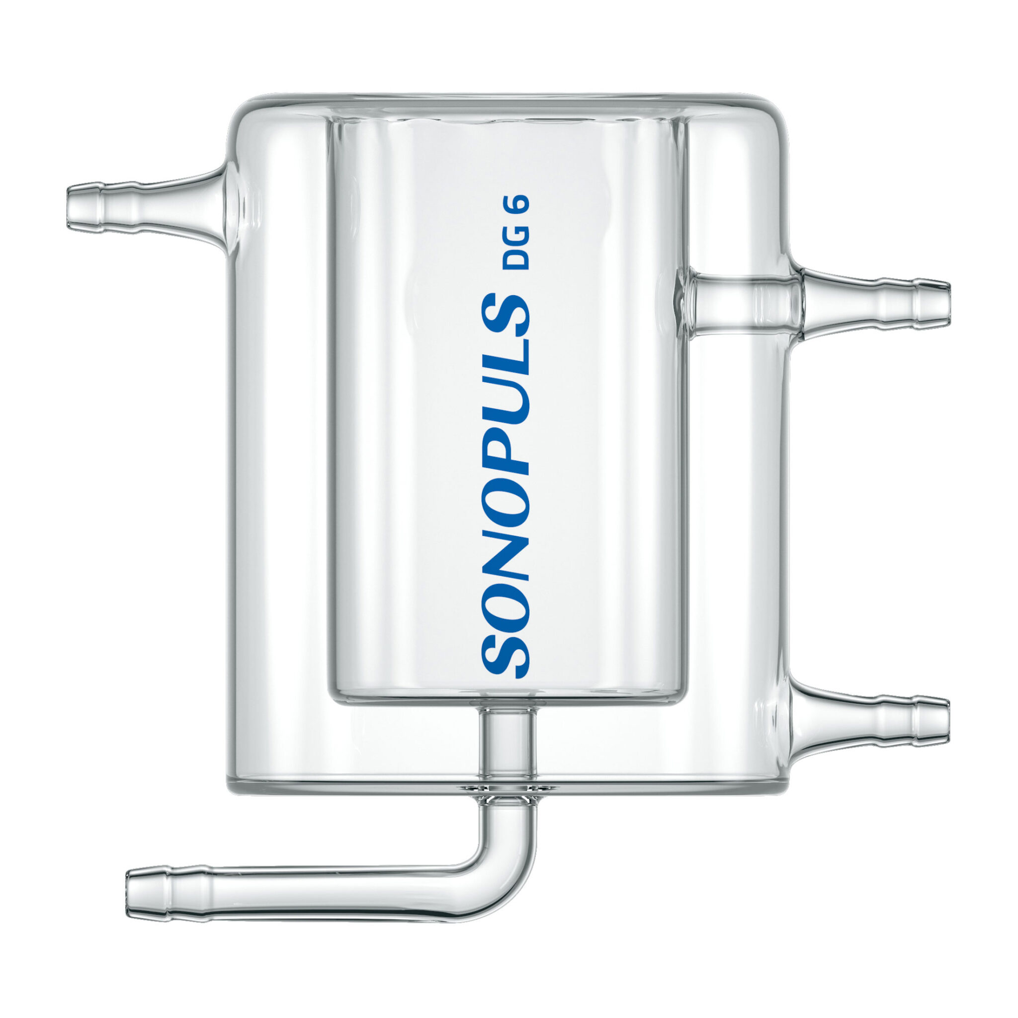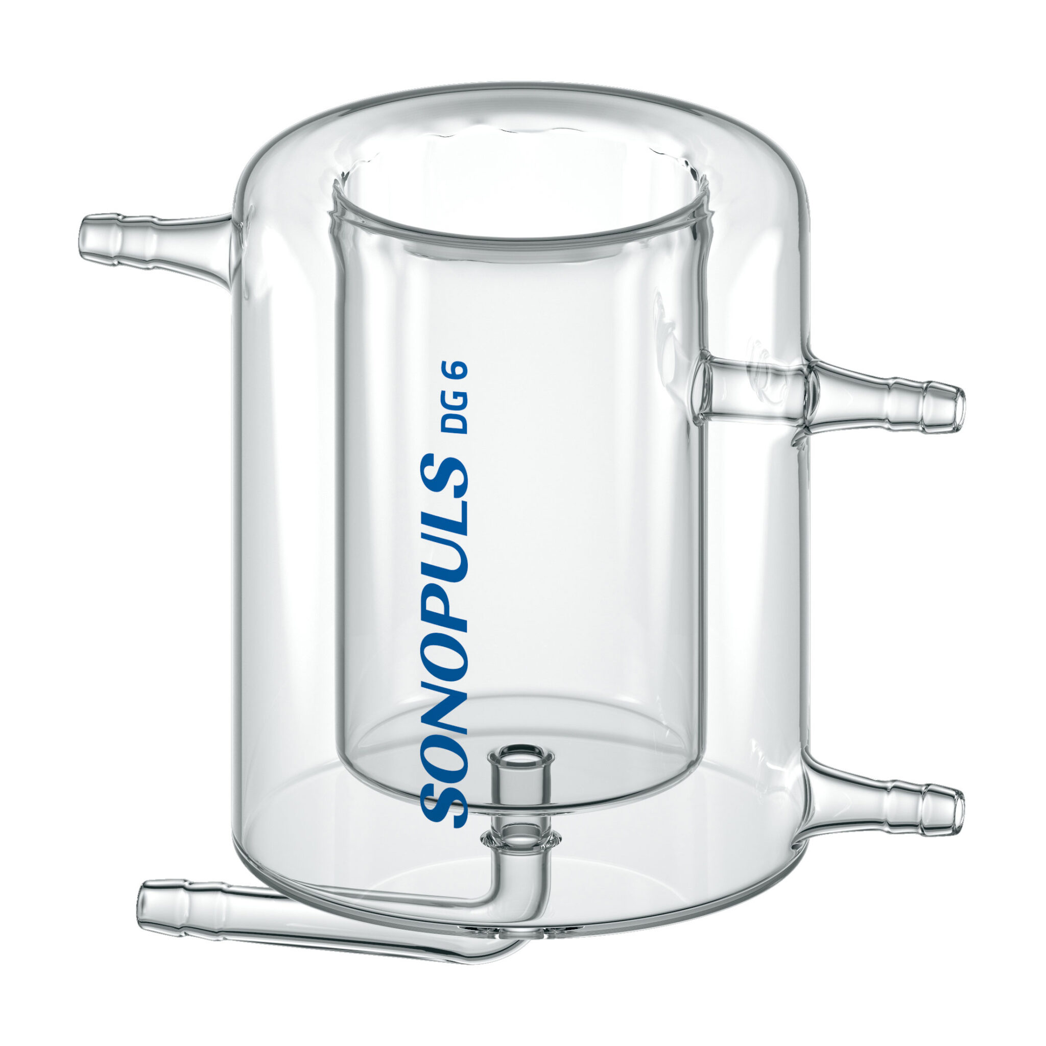 Durchflussgefäß DG mit Kühlmantel. Zur kontinuierlichen Beschallung größerer Mengen im Durchfluss. Der Kühlmantel gestattet eine Temperierung durch flüssige Kühlmittel während der Beschallung über vorhandene Schlauchanschlüsse.
